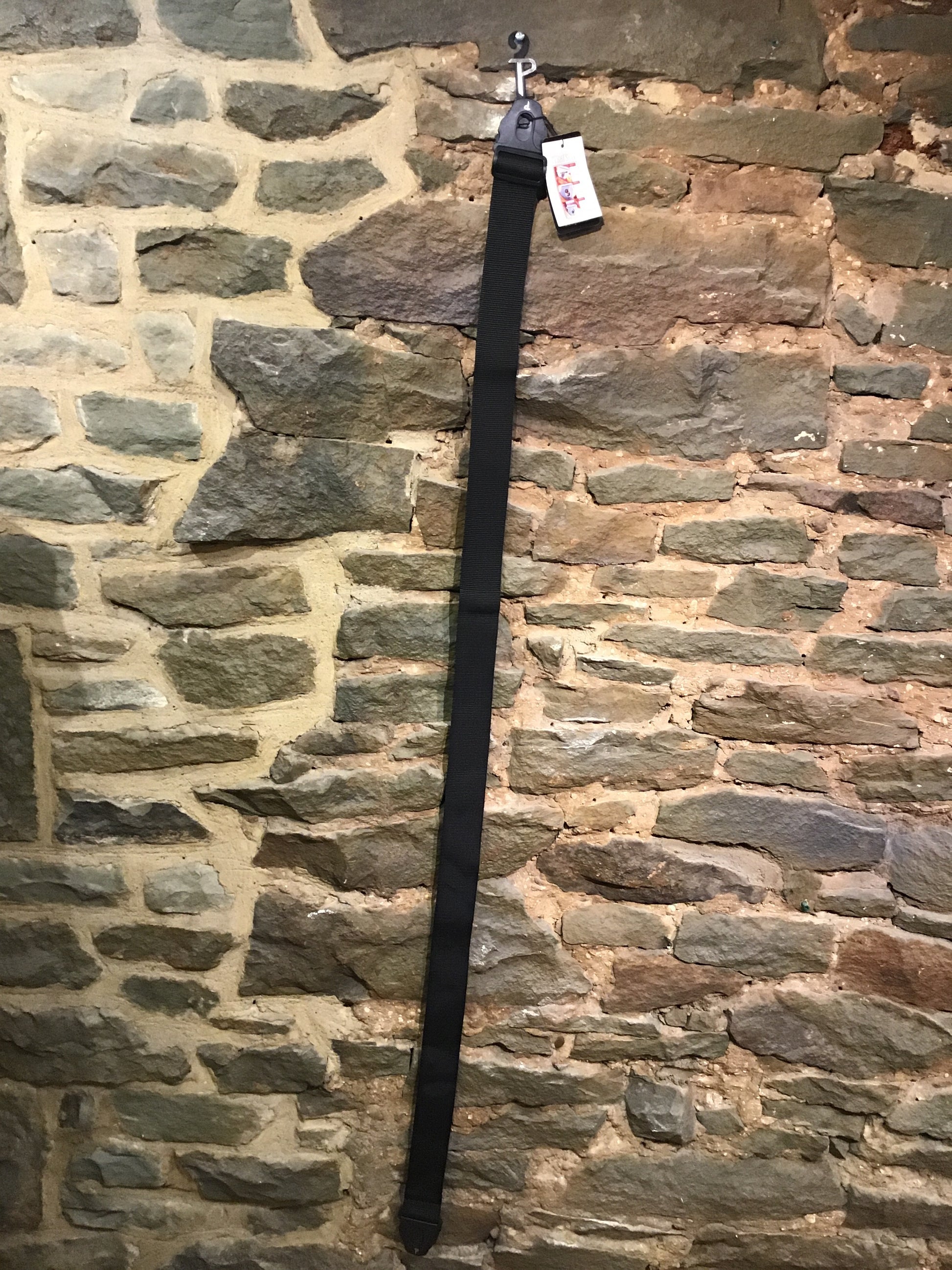 20 inches wide, adjustable up to 56 inch length. Unique strap lock system prevents the strap from slipping off the guitar strap button. Black nylon strap.