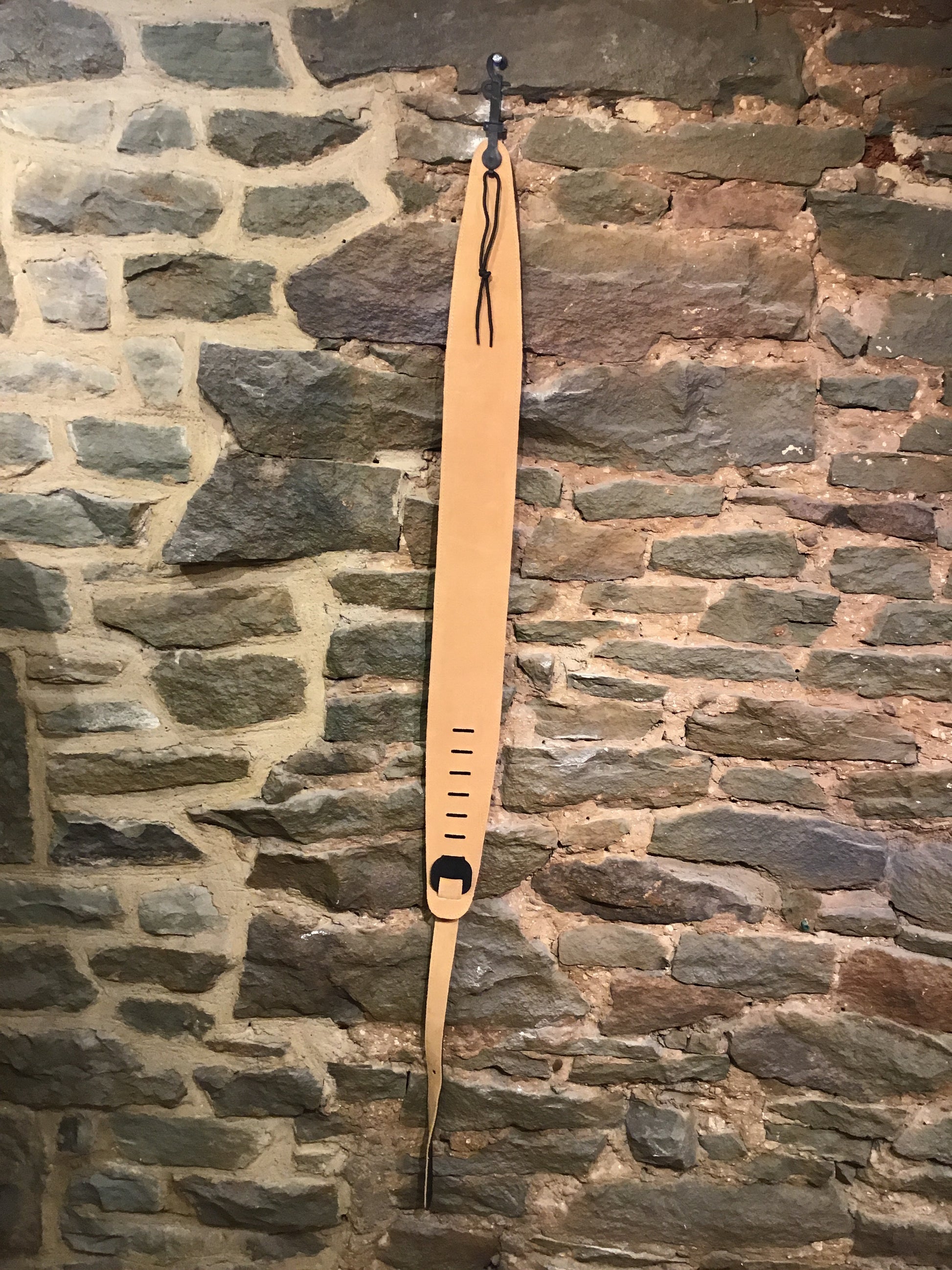3.5 inches wide, adjustable up to 51 inch length. Soft black suede on one side, soft tan suede on the other. Has a premium feel.