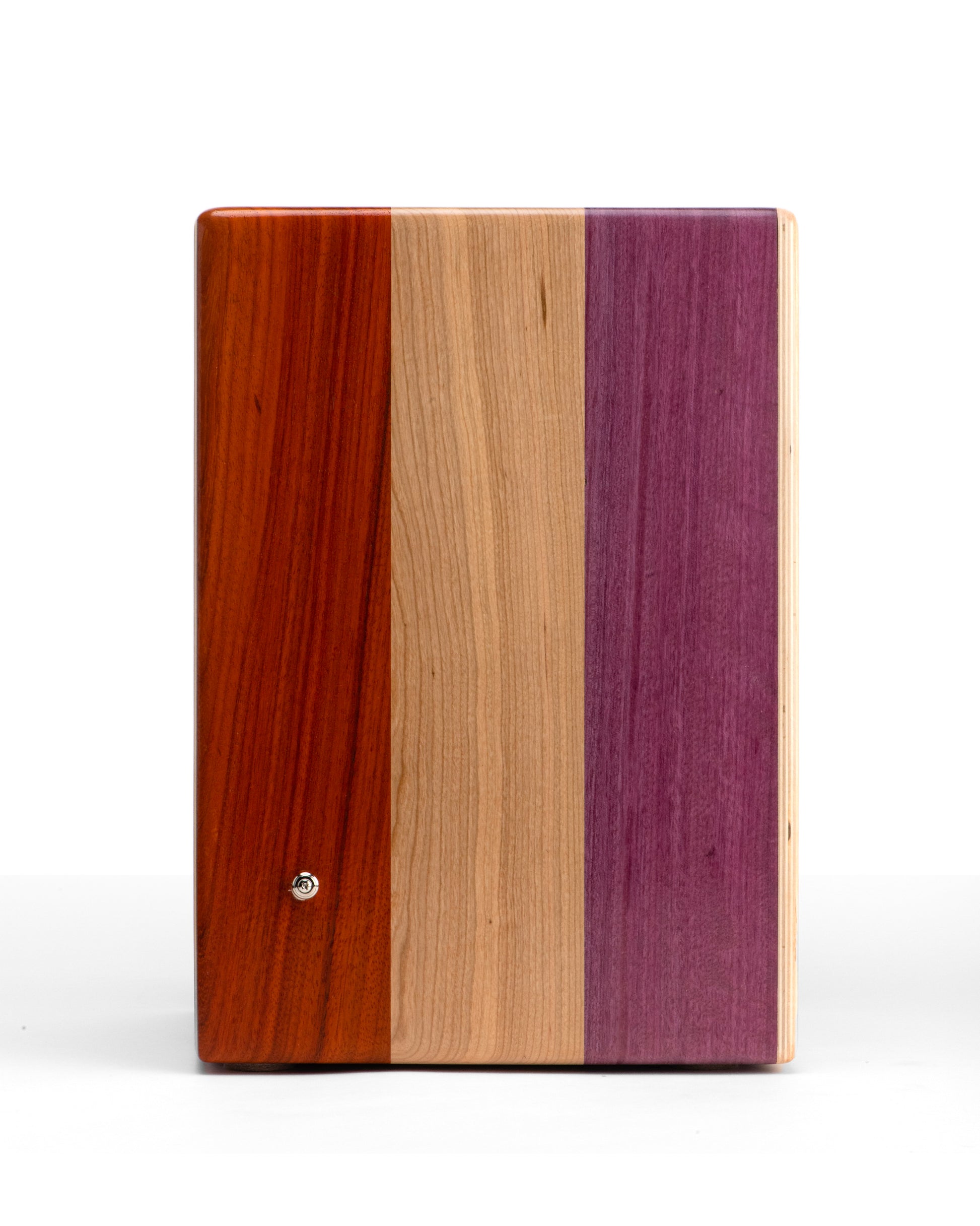 Solid padauk, cherry, and purple heart cajon with matching external snare.